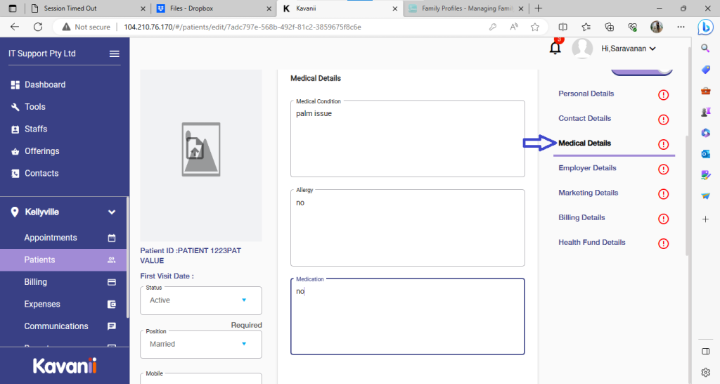 To update the medical condition of the patient like what is the patient’s issue, any allergies to medicines, and previous medication, please click on medical condition :
