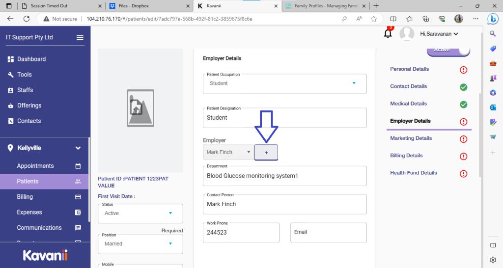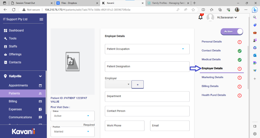 To update patient employment details like occupation and business details, please click on the employer details tab: