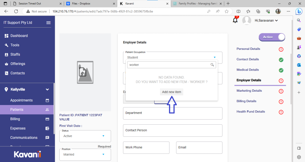 Under the designation, if the patient’s occupation is not mentioned, you can type it and click on add a new item to add it to the list: