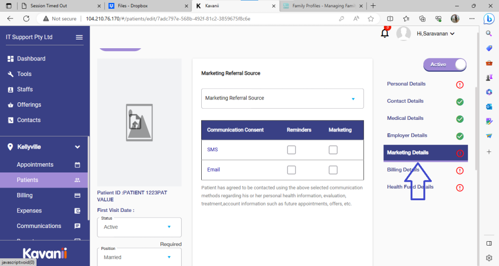 Under marketing details, you can add how the patient has been referred to us (the source patient came to us like newspaper, email, personal referral ) and also the patient’s communication preference for email and SMS: