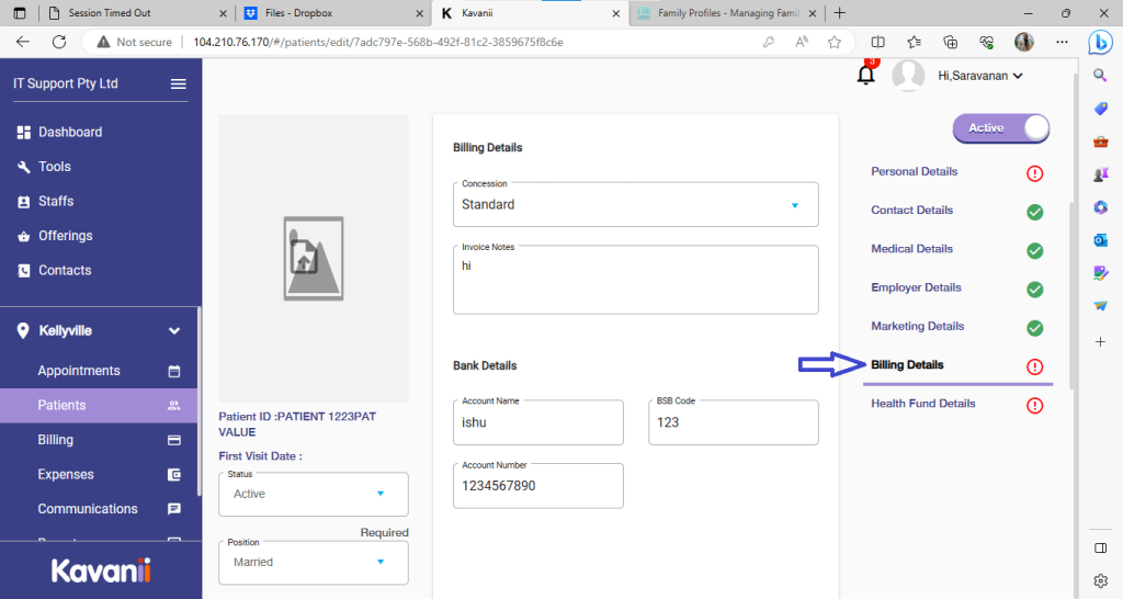 To add patient bank account details: Please select billing details and choose the concession option and pensioner if eligible for a concession or choose standard and add patient bank account details: