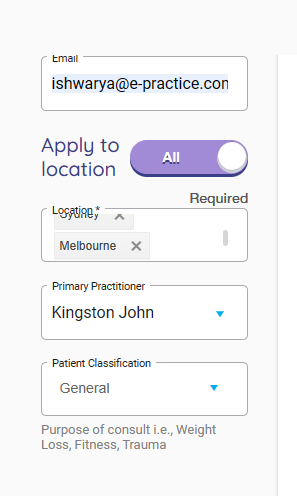 Scroll down to add patient clinical details here, like practitioner, the reason the patient is coming to us, and patient location: