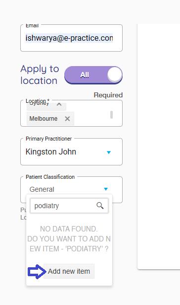 Under patient classification, if a patient contacts us for a new classification other than listed, like podiatry, psychology, or general, we can add a new item by just typing the classification name, and you will have the add new item button as shown below:
