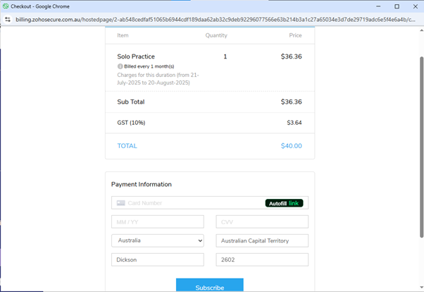 4. A page will be opened up with billing details and to add card details for the payment option, kindly add the details and click on subscribe to complete the subscription.