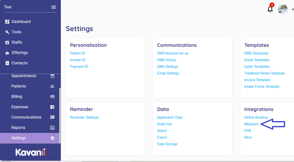 To set up Medicare from the Kavanii website, please click on settings and choose Medicare:
