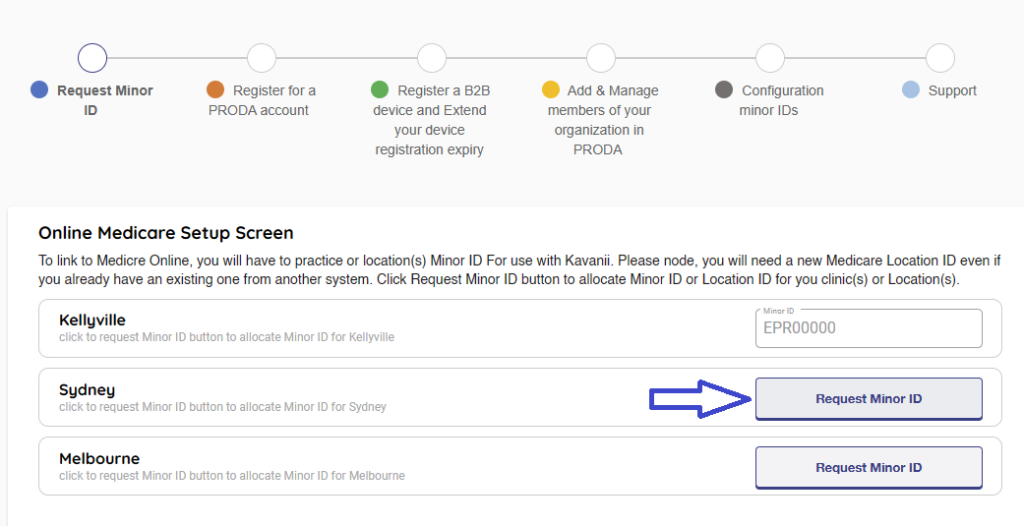 To link to Medicare Online, you must practice or location(s) Minor ID For use with Kavanii. Please note that you will need a new Medicare Location ID even if you already have an existing one from another system. Click the Request Minor ID button to allocate a Minor ID or Location ID for your clinic(s) or location (s).
