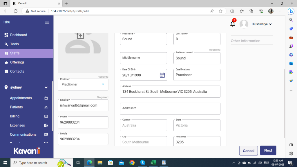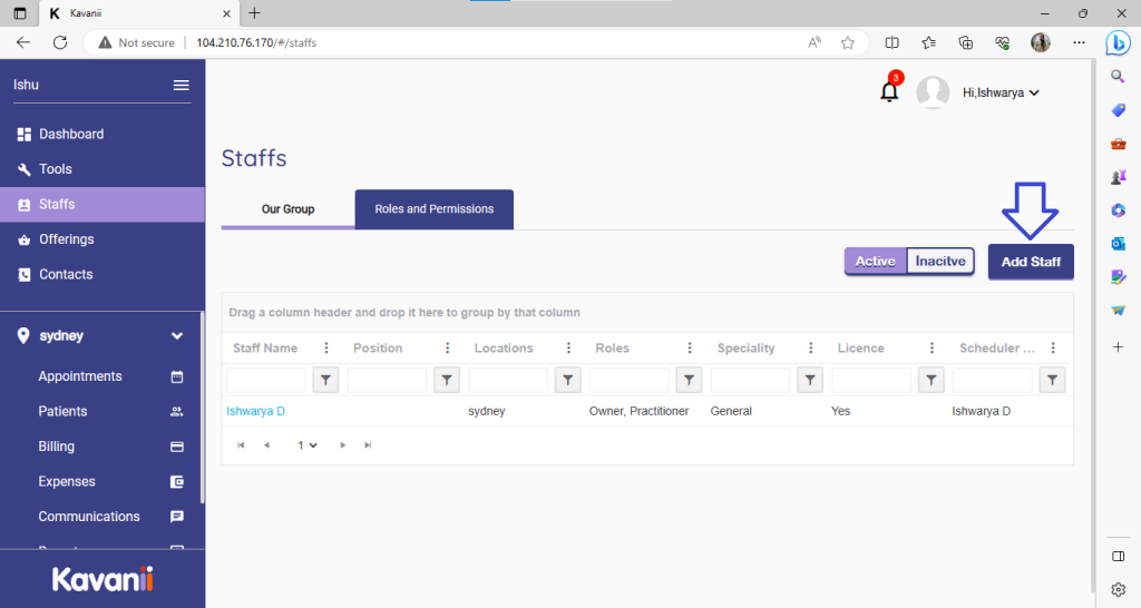 To add a staff, click on staff on the left menu and click on the Add Staff button. Here, adding a staff as a practitioner: