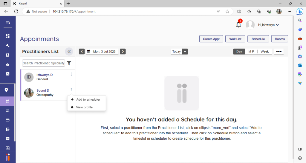 Click on the three dots near practitioner, and set add to scheduler: