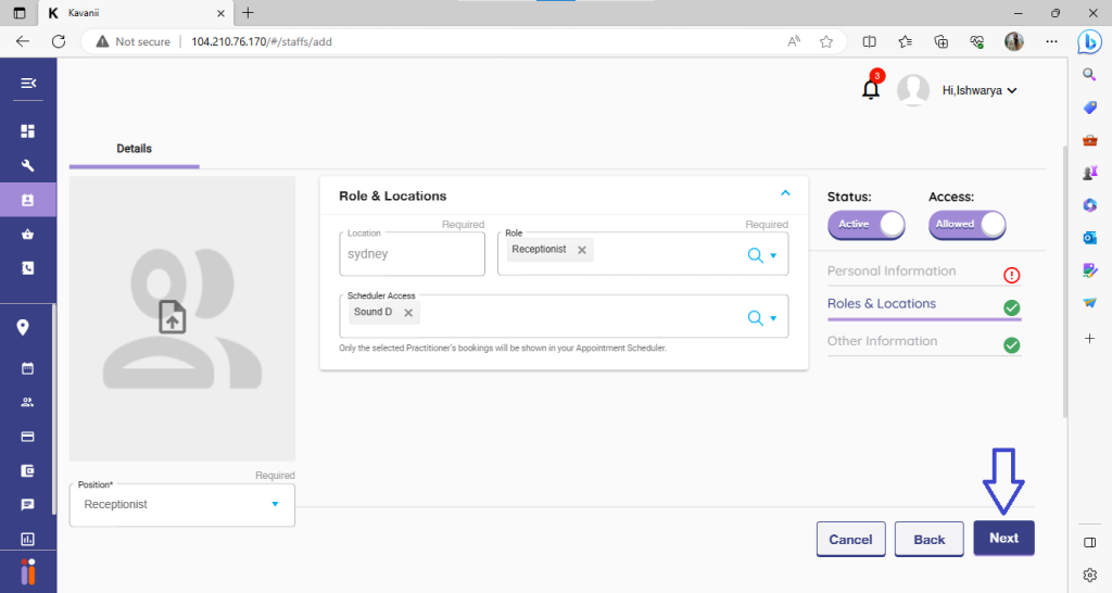 Once you click on the “Add staff” option, you will land on a page; we need to upload a photo of the staff and then choose the staff position.