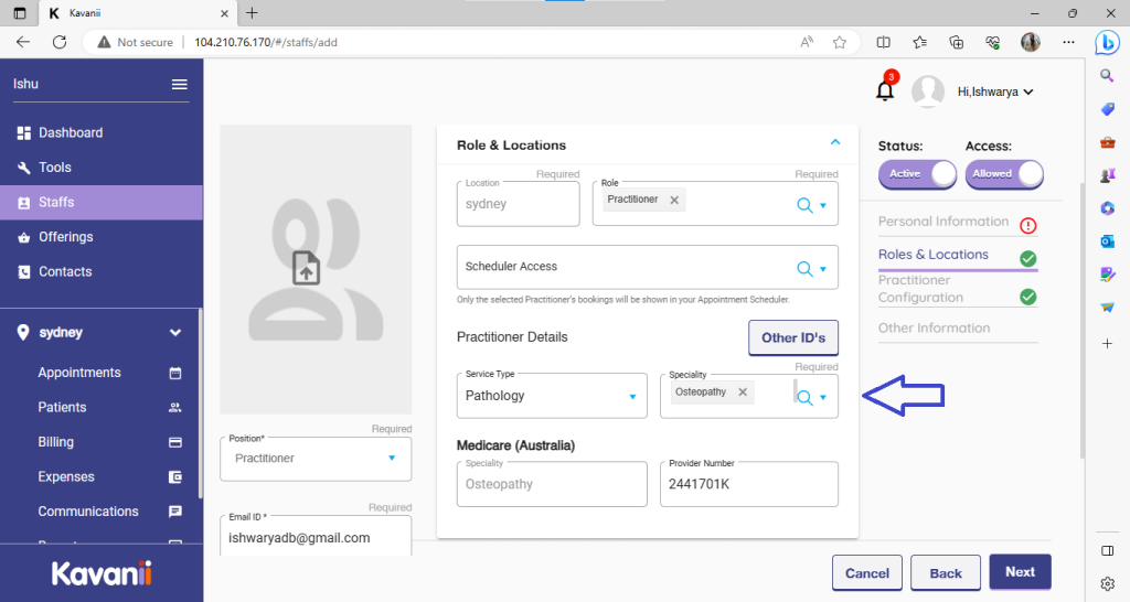Once we select the role as a practitioner, we need to add the practitioner speciality and their provider number: