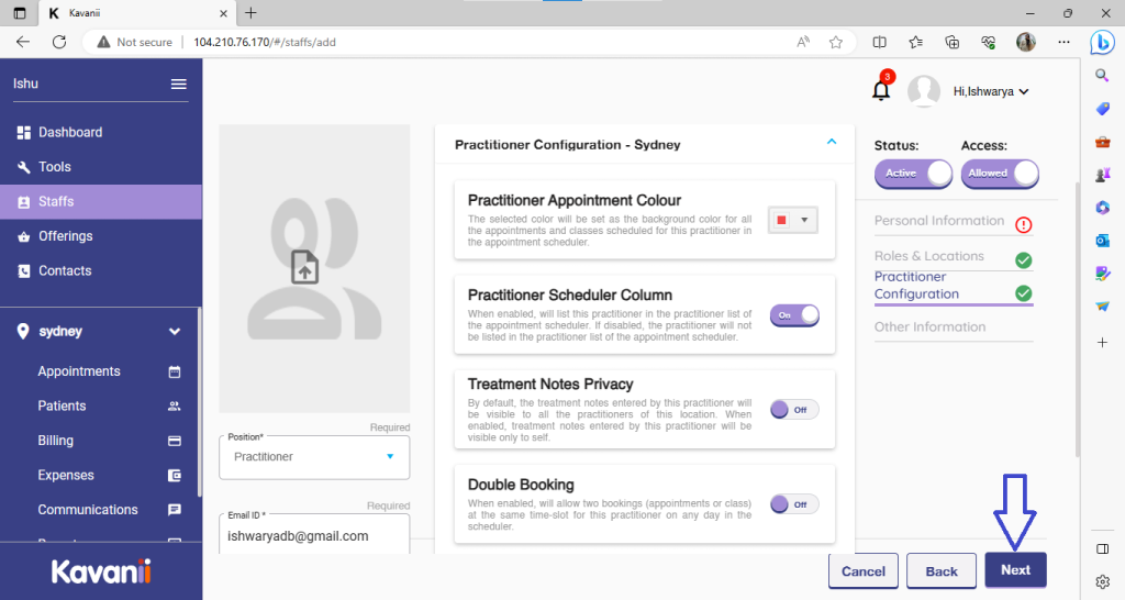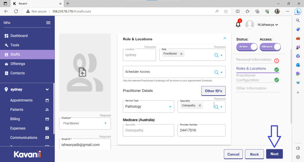 Once done with adding practitioner information, please click on next: